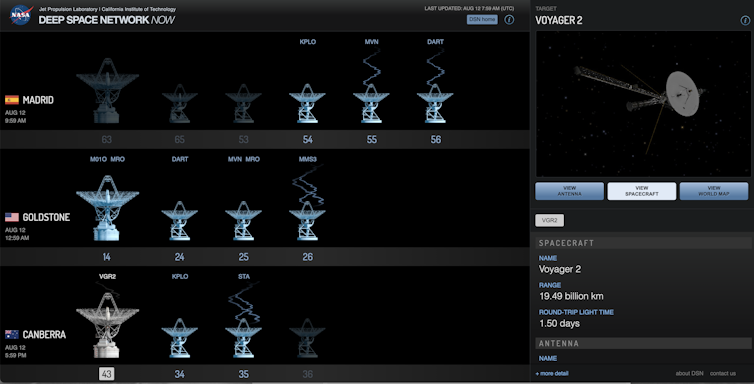Both spacecraft send reedy signals that wend their way between the planets to the three antennas which are still listening: Tidbinbilla, Goldstone and Madrid.
